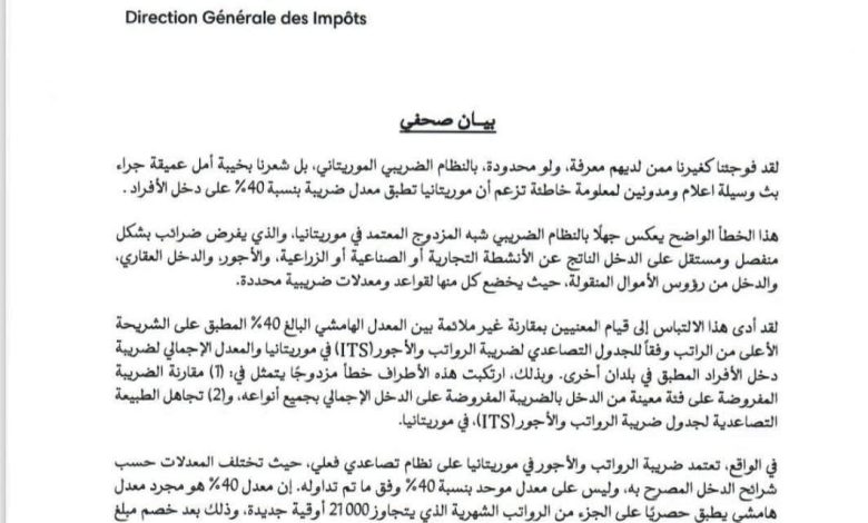 وخلصت المديرية إلى أن النظام الضريبي الموريتاني “شفاف وعادل ومتدرج بما يتماشى مع الواقع الاقتصادي للبلد”، داعية جميع المهتمين إلى التحقق من مصادرهم قبل نشر أي معلومات، والرجوع إلى النصوص القانونية والسلطات الضريبية المختصة لتفادي اللبس والحفاظ على صورة البلد وثقة المستثمرين.