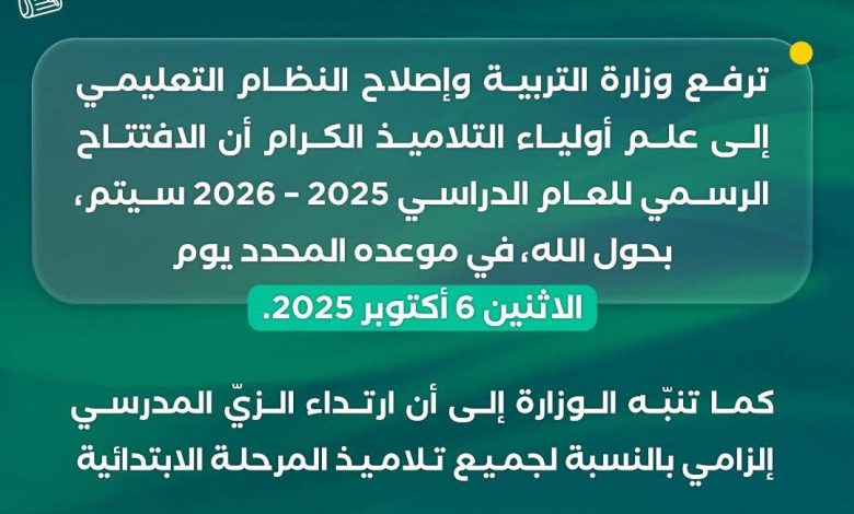 أكدت وزارة التربية وإصلاح النظام التعليمي أن الافتتاح الرسمي للعام الدراسي 2025 – 2026 سيكون في موعده المحدد يوم الإثنين 6 أكتوبر 2025.