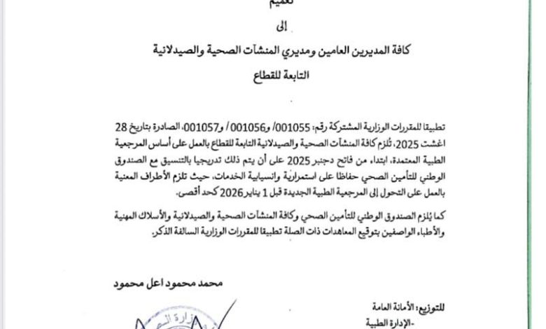 وزارة الصحة تصدر تعميما بخصوص المرجعية الطبية إلى كافة المنشآت الصحية .