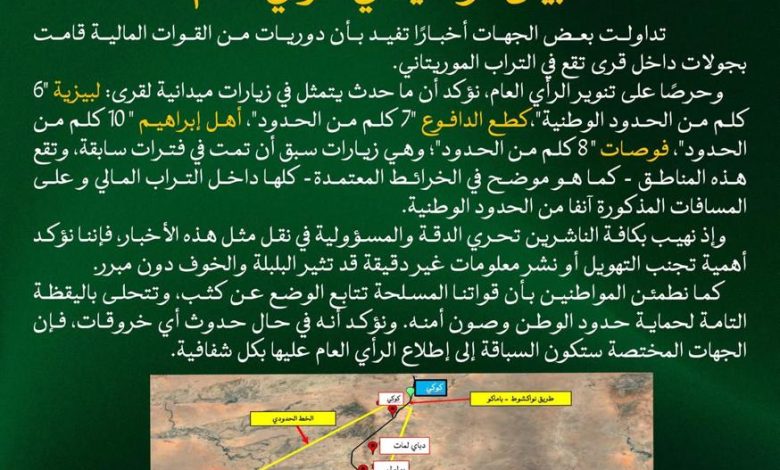 جاء ذلك عبر بيان أصدره مساء أمس السبت، نفى خلاله ما تم تداوله حول دخول قوات مالية إلى قرى موريتانية، مشيرا إلى أن القرى المذكورة تقع داخل مالي وفق الخرائط المعتمدة.